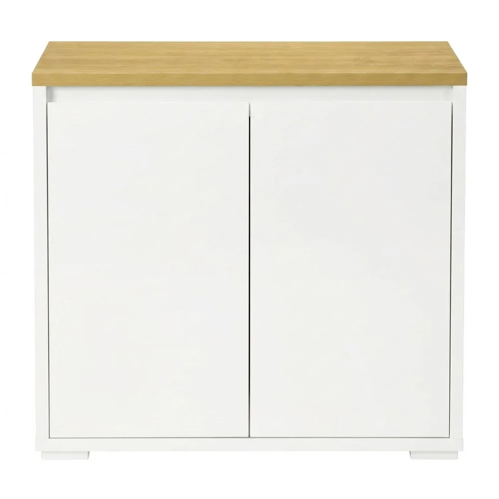 Este aparador con encimera de madera y estructura blanca se integra en cualquier habitación. Cuenta con dos armarios con puertas y un estante interior ajustable en altura, proporcionando espacio de almacenamiento. Mantén tus objetos organizados y protegidos del polvo. Su diseño versátil permite su uso en comedor, oficina o cualquier lugar donde se requiera almacenamiento. Fabricado en melamina de madera, es resistente y fácil de limpiar. Incluye un sistema anti-vuelco y patas con almohadillas antideslizantes para mayor seguridad. Dimensiones: 80 x 37 x 75 cm (L x An x Al). Capacidad de carga: 30 kg (encimera), 15 kg (estante fijo), 10 kg (estante ajustable). Montaje requerido.