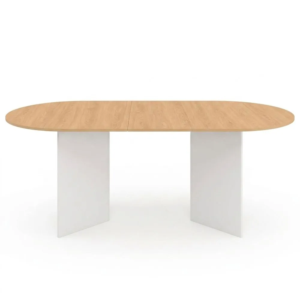 Mesa de comedor extensible con bandeja ovalada y base geométrica. Ampliable hasta 200 cm gracias a su extensión de 40 cm, permite acomodar hasta 10 personas, ideal para reuniones grandes. Forma ovalada que facilita el movimiento y uso del espacio. Mesa versátil que se adapta a todo tipo de interiores con color madera y blanco. Aspecto contemporáneo gracias a su base de diseño audaz. Para 6 a 10 personas, dimensiones: largo 160-200 cm x ancho 90 cm x alto 75 cm. Material: MDF.