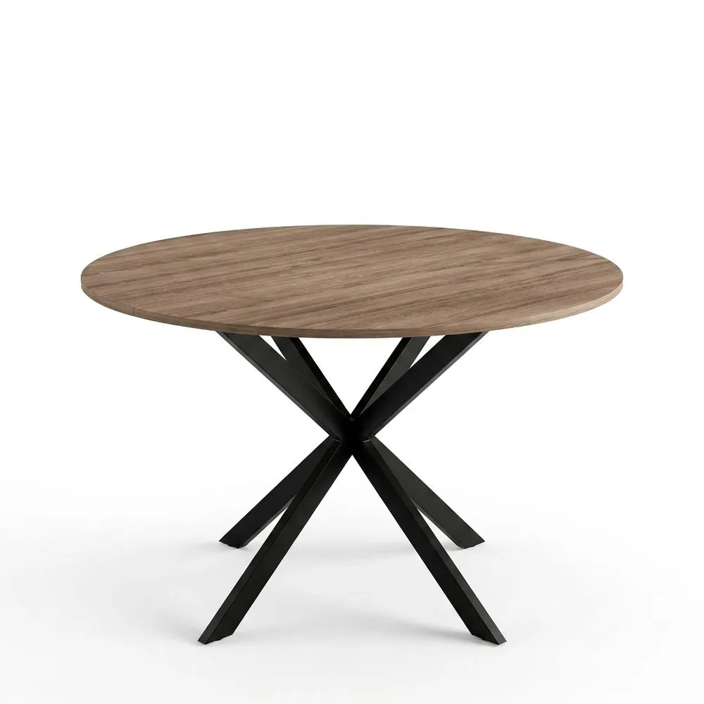 Mesa de comedor de 120 cm de diámetro, adecuada para 4-6 personas, con forma redonda que favorece el encuentro. Ofrece suficiente espacio para utensilios, plantas decorativas y postres. Puede ser utilizada como mesa de comedor, de café o de cocina. La base en pedestal en forma de X proporciona estabilidad adicional con patas de acero al carbono y pies antideslizantes que protegen el suelo y reducen el ruido al mover la mesa. Mesa de MDF fácil de limpiar y mantener, con un tablero de 15 mm de grosor. Acabado en chapa de nogal y patas de metal negro. El lacado claro mantiene el tono natural de la madera y ofrece protección duradera. Esta mesa es versátil y se integra fácilmente en la decoración del hogar, siendo adecuada para pequeños espacios como apartamentos, comedores, salas de conferencias, cocinas, cafés, salas de juegos, etc. Fácil de montar con set completo de tornillos, herramientas e instrucciones. La superficie lisa permite una limpieza rápida con un paño húmedo.